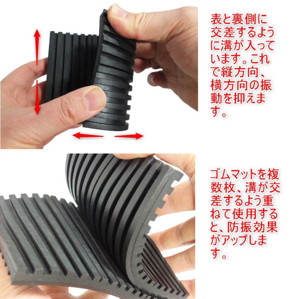 カッターでお好きなサイズにカットして戴けます。手を切らないように注意してください。 画像の使用カッターは100円均一のものです。カットして戴けます。 表と裏側に交差するように溝が入っています。これで縦方向、横方向の振動を抑えます。 ゴムマットを複数枚、溝が交差するよう重ねて使用すると、防振効果がアップします。画像参照。