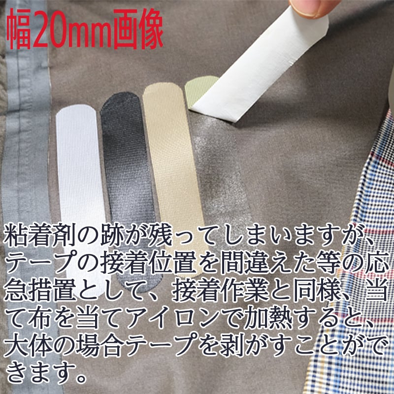 粘着剤の跡が残ってしまいますが、テープの接着位置を間違えたなどの応急措置として、接着作業と同様、当て布を当てアイロンで熱を加えると大体の場合、テープを剥がすことができます。