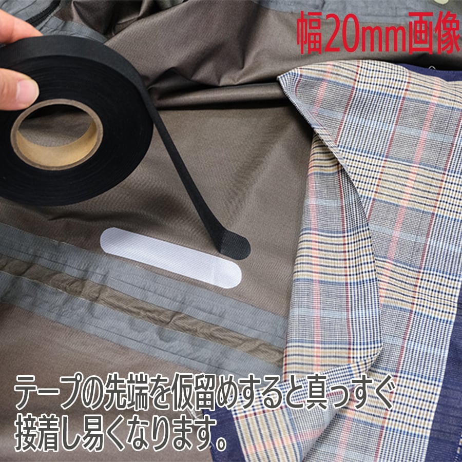 熱が加わることによって貼りつけられるテープです。トリコット/経編(たてあみ)になっている面を上に、ツルっとした面を下に、当て布を当ててアイロンはドライ設定、低中温程(10~20秒目安)で作業をしてください。(当て布はご自宅のハンカチなどで代用できます。薄い生地で綿のものが適しています。)