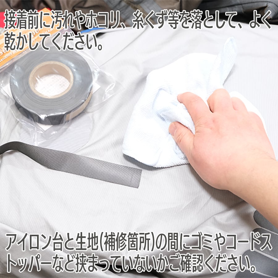 1.油分などの汚れ、水分、砂や糸くずなどが入り込んでいると接着力が弱まります。シームテープ熱圧着前にきれいに拭き取り、加工する部分を乾燥させてください。(テープの角を丸く切ると剥がれにくくなります。)