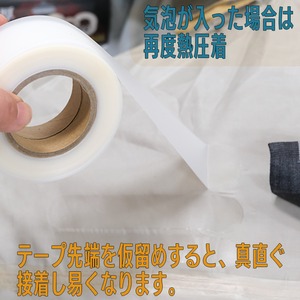 熱圧着後、熱が冷めた後でも、一旦接着したように見えてテープが硬くなり剥がれてくる場合があります。アイロンの温度が低く接着できていなかった可能性があります。しっかり接着すると透明になりテープの脇から糊がはみ出ます。接着できていなかった場合、テープが白く濁った感じになっています。当て布の厚さや、圧着力、それぞれ作業環境が違う為、時間温度調整等をよろしくお願いいたします。