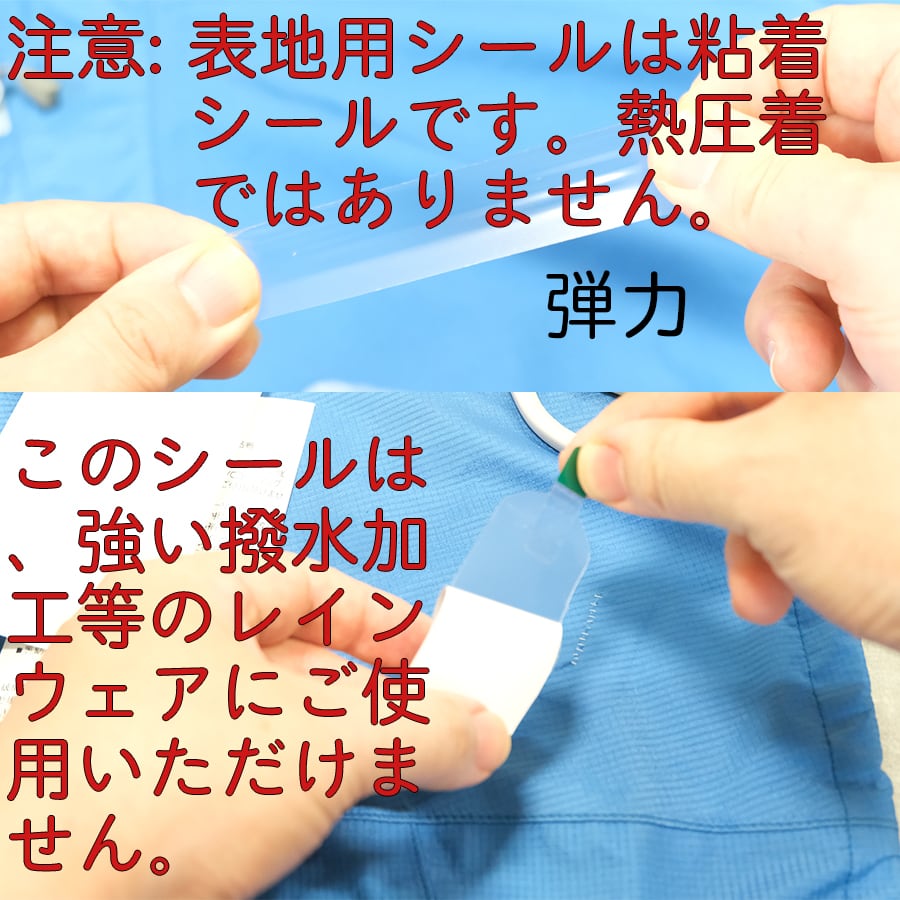 特に応急ストレッチシールは全てのレインウェアにご使用いただけるものではございません。強い撥水加工、シリコンコーティングやPVCコーティングされた生地表面、起毛生地にはご使用戴けません。パッケージ注意書きをお読みください。